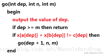 题意:给定这样一个递归的程序,其中x[n]数组为未知数,并且取值只有0或1;a[m]、b[m]、c[m]为给定数组,其中0 <= a[i], b[i] < n,0 <= c[i] <= 2,并且n<=200, m<=10000。求这个程序能够输出的最大的dep的值。