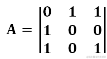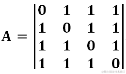 剩下的就是PKU 2888的一种特殊情况,颜色相同的珠子不能相邻,于是我们参考PKU 2888的算法,唯一不同的就是这个可达矩阵是已知的,不依赖于输入数据,它一定是一个除了主对角线是0其它均为1的“反单位矩阵“,如图30所示,表示的是4种颜色的情况下的可达矩阵: