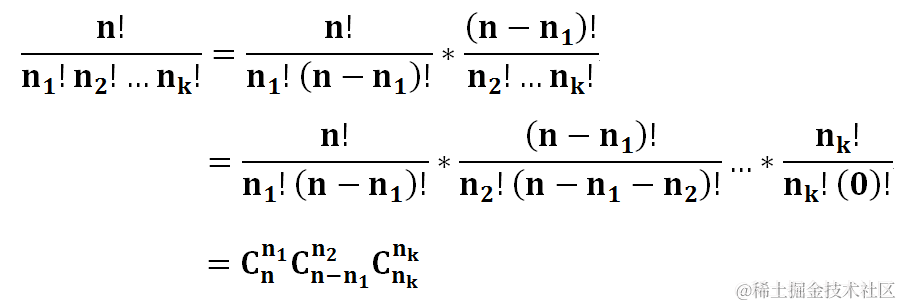 还是运用多重集排列,这题不需要用到大数,我们可以将多重集排列的公式做一个转化: