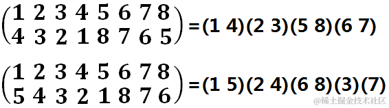 表示成置换群乘积的形式为(15)(24)(36)(48)。