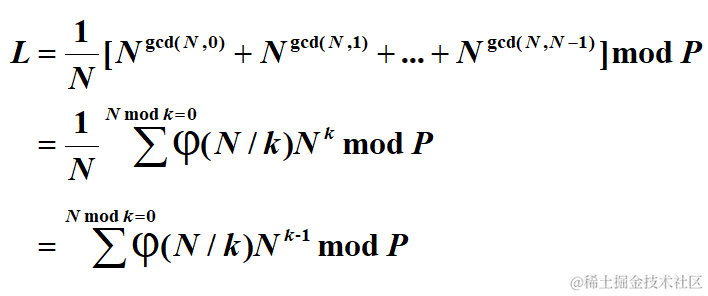 ****题意:给定一个由n个珠子组成的项链,穿成环状,每个珠子有n种颜色(n <= 10^9)。问总共有多少种项链,项链旋转后相同算成一种。由于数据量巨大,只需要输出最后的结果模P。