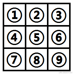给每个格子编个号,每个格子有10种颜色,总共9个格子,总情况数10^9,已经没办法枚举出来了。继续从Burnside引理的定义出发,|D(gi)|代表在gi这种置换作用下没有改变状态的方案个数,置换总共四种,那么我们将这四种置换都列出来: