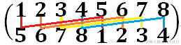 举个例子,循环左移4格置换表示如下,它的循环节为4,每个循环内珠子的个数为2,即(15)(26)(37)(48)各自同色。那么我们只需要将a[i]分成2组,一组分配给(1234),一组分配给(5678)。而且两者分配的时候顺序要保持完全一致,所以只需要考虑将{a[i]/2 | i<m}分配给(1234)的情况。这就转化成了4个元素的多重集全排列问题了。