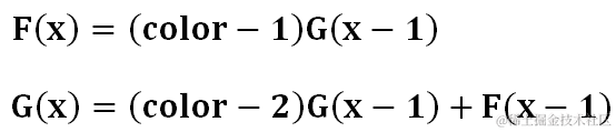 两个函数互相嵌套,相辅相成。这可怎么办?我们可以将其中一个带入另一个,如图所示,化成G(x)的递推式,这样可以将G(x-1)求出来,然后乘上color-1自然就是F(x)。