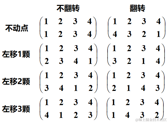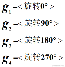 将每种旋转认为是一种"置换",定义为gi,则上述问题总共有4种置换,分别描述为: