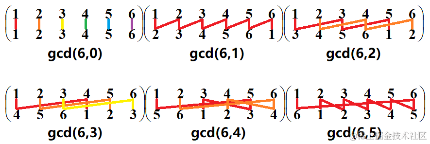 由于n比较大,模拟项链旋转算循环节的方法不再适用,但是环形旋转得到的循环节是有规律的。长度为n的环状结构旋转i格后当前置换的循环节个数为gcd(n, i),每个循环长度为n/gcd(n,i)。如图11展示的长度为6的6种置换各自的循环节: