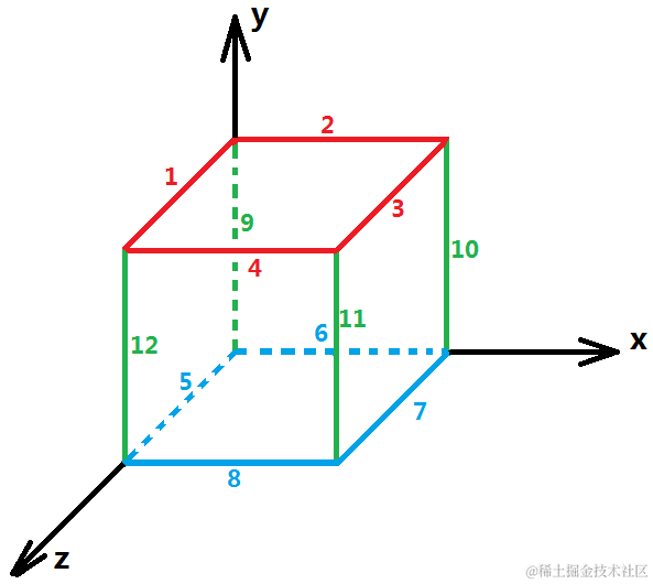 首先将立方体的每条边进行编码,顶面四条边(红色)为1234,底面四条边(蓝色)为5678,垂直的四条边(绿色)为9101112。那么将任意边和y轴重合,最多衍生出两种状态,也就是总的置换数为:边数×状态数=12×2=24。