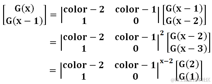 G(x)这个递推式就很熟悉了,直接用矩阵二分来求就行了。求出G(x-1),那么F(x)=(color-1)G(x-1)。