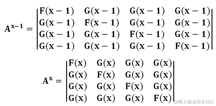 由于这个矩阵的特殊性,我们发现无论乘多少次,这个矩阵永远只有两种值:主对角线的值和非主对角线的值。令A^x的主对角线的值为F(x),非主对角线的值为G(x),那么A^(x-1)和A^x表示如下: