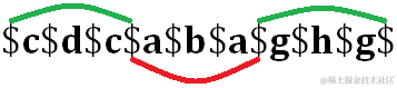 以上算法只支持字符串长度为奇数的情况,那么接下来我们通过一种方法,将偶数字符串转换成奇数。如图所示,相邻字符间插入一个不在该字符串的字符集中的字符,比如$。原串长度为s,则转换后的串长度为2*s+1,所以必然为奇数。