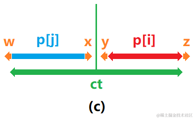 (c)的情况,p[i]=ct+p[ct]-i,而且不可能再长。还是利用反证法,如果p[i]两边可以再扩张一个字符,如图中的y和z部分相等,那么必然x和y部分也相等(根据对称性),而x和w也相等,从而w和z相等,这样说明原本的p[ct]可以再增长,而p[ct]已经确定了,所以假设不成立。