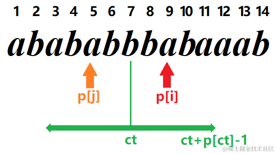 然后再循环判断第i-p[i]个字符和第i+p[i]个字符是否相等,如果相等则p[i]++;否则退出循环。然后利用新的i+p[i]更新ct。