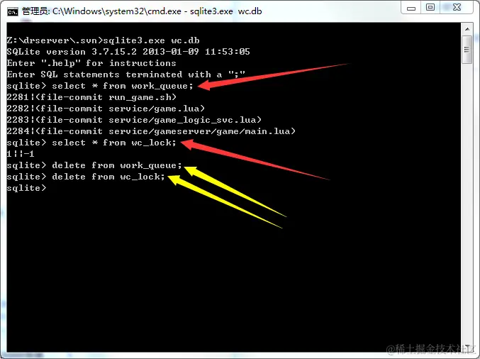 然后就可以执行 sql 语句查表了,主要查 work_queue 和 wc_lock 两张表。发现表非空,执行 delete 语句将对应的表项删除,就能正常进行 svn clean up 了,如图三所示。
