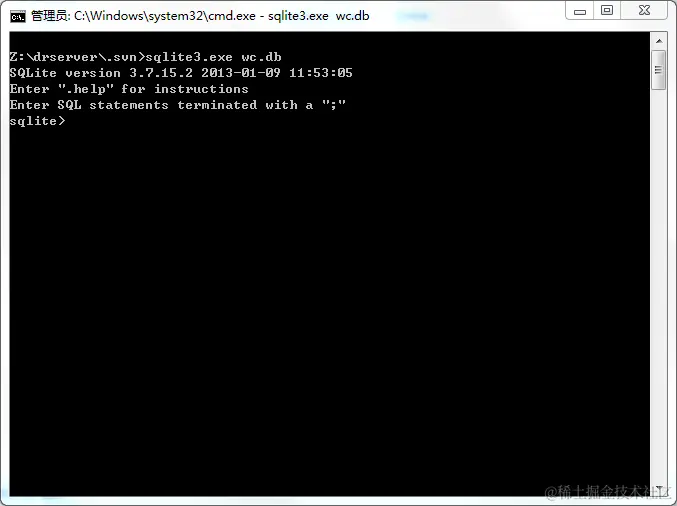 这种情况下,我们可以下载一个 sqlite3.rar 。解压后,将 exe 文件放在出现问题的 svn 的 .svn 文件夹下,然后在这个目录下 shift + 右键 调出命令行。在命令行输入 sqlite3.exe wc.db,如图二所示。