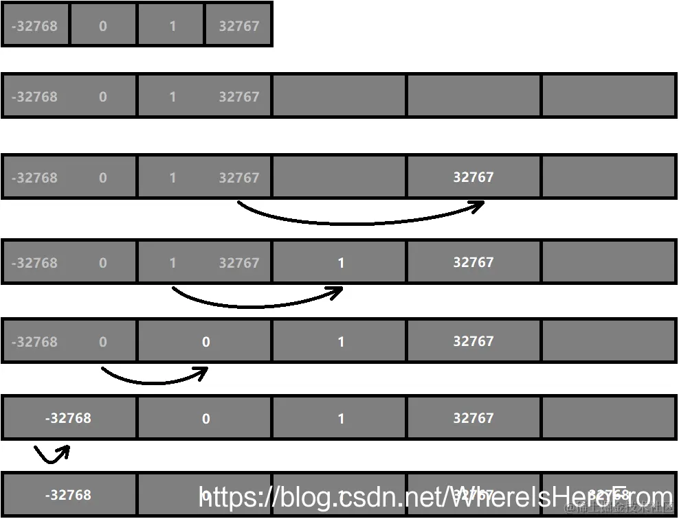 如图展示了一个 (-32768, 0, 1, 32767) 的整数集合在插入数字 32768 后的升级的完整过程:
