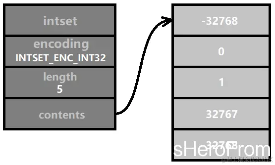然后我们插入一个数,它的值为 32768,比 INT16_MAX 大1,所以它需要采用 INTSET_ENC_INT32 编码,而整数集合中所有的数的编码需要保持一致。那么,所有数的编码都需要转为 INTSET_ENC_INT32 编码。这就是 “升级”。如图所示: