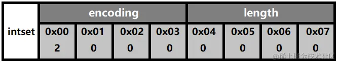 intrev32ifbe 的意思是 int32 reversal if big endian。即 如果当前主机字节序为大端序,那么将它的内存存储进行翻转操作。简言之,intset 的所有成员存储方式都采用小端序。所以创建一个空的整数集合,内存分布如下: