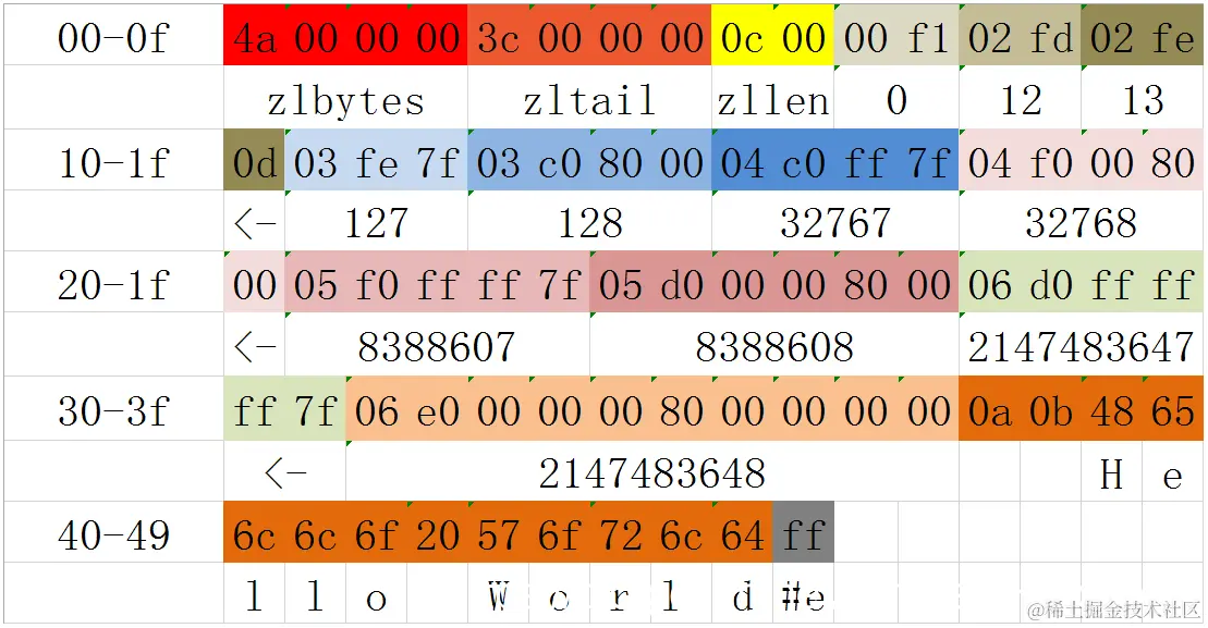 接下来就是每个结点了,结点的第1个字节代表它前驱结点的长度,结点元素 0 和 12 采用的是 |1111xxxx| 编码;13 和 127 采用 |11111110| 的 8 位整数编码;128 和 32767 采用的是 |11000000| 的 16 位整数编码; "Hello World" 这个字符串被看作是一个结点整体,它的两个额外字节 0a 和 0b 分别代表 前面结点 2147483648 的长度 和 本身编码 |00xxxxxx| (b 是 十进制中的 11,代表 "Hello World" 字符串的长度)。