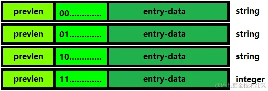 encoding 字段可能占用1个字节,也可能占用多个字节,完全取决于第一个字节的编码。当 encoding 字段的第一个字节的前两个比特位为 00、01、10 时,代表这个结点是个字符串。为11时,代表这个结点是个整数。