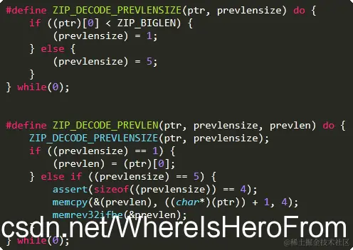 有 encode 就有 decode,decode 就是将内存中的值反序列化到临时变量中方便逻辑使用,它是 encode 的逆运算。宏 ZIP_DECODE_PREVLEN 就是做这个 decode 的,具体实现如下: