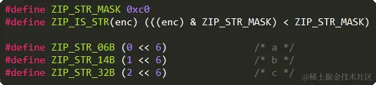 ZIP_STR_MASK 的二进制表示为 11000000,所以 ZIP_IS_STR 的位运算的含义,就是根据 enc 这个字节的前两位来判断这个结点是否是字符串。