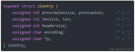 这是压缩列表结点的结构体,但是实际存储的时候并不是这样的,只是在进行计算的时候需要把结点从内存编码中转换出来才方便写逻辑。于是,有了这么一个结构体。