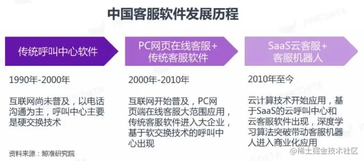 想象在互联网还未普及的20年前,客服服务主要还是以人工连线的方式,在近近十年,在线客服才开始出现,直到2010年左右,基于SaaS的云呼叫中心和云客服软件才开始出现