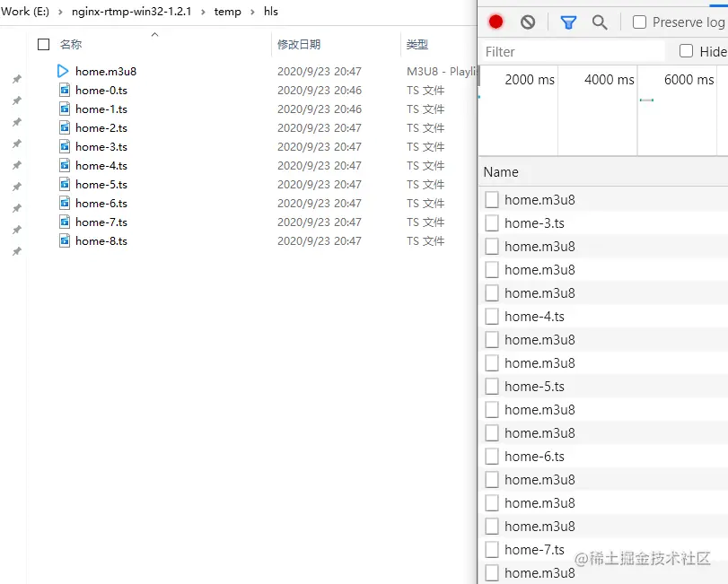使用 hls 推流,我们可以在本地目录看到不断更新的 m3u8 文件,不断生成的 ts 文件,这些文件会被浏览器不断请求,推流结束之后这些本地文件就会被删除。