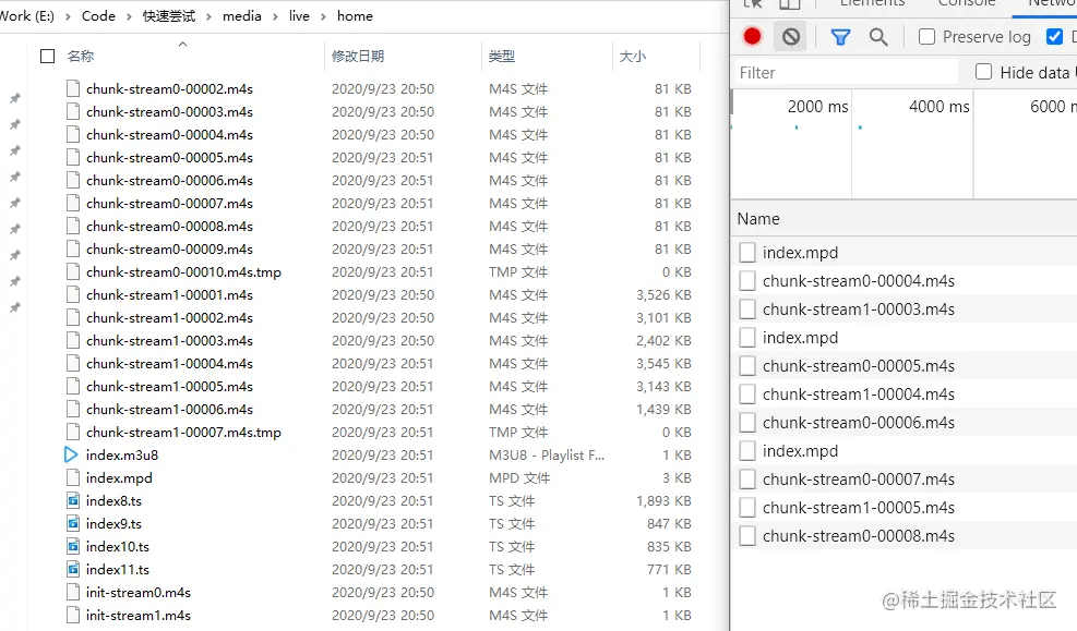 根据以上代码的配置,推流之后,可以同时支持四种拉流地址。此时,就可以在本地同时看到 ts 文件和 m4s 文件分片。