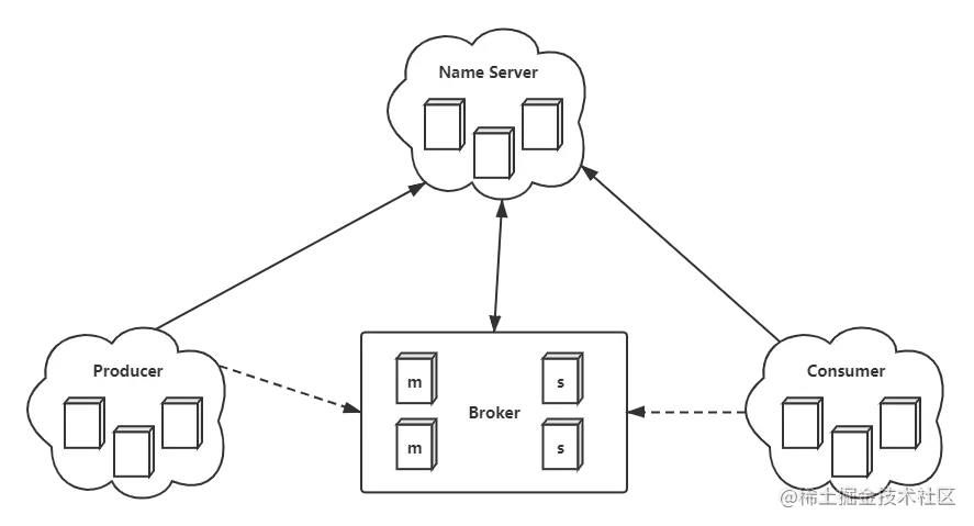 RocketMQ 的核心组件,绝大部分工作都在 Broker 中完成,接收请求,处理消费,消息持久化等;