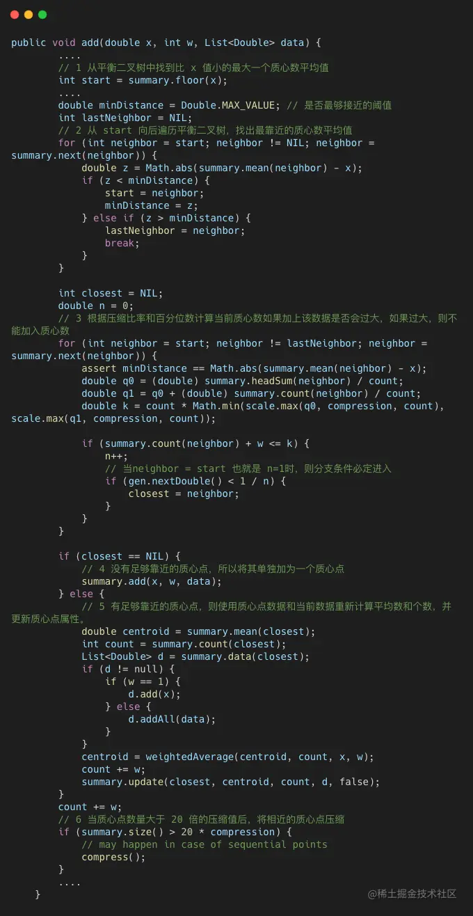 而 AVLGroupTree 与 MergingDigest 相比,多了一步通过 AVL 二叉平衡树搜索数据最靠近质心数的步骤,找到最靠近的质心数后,也是将二者进行 merge,然后判断是否超过 weight 上线,进行修改或者创建操作。