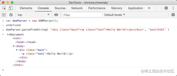 大多数浏览器都提供了 DOMParser Web API 来从 HTML 代码中构建 DOM 树。 DOMParser 类的一个实例代表了一个 DOM 解析器,使用 parseFromString 原型方法,我们可以将原始的 HTML 文本(代码)解析成一棵 DOM 树(如下图所示)。