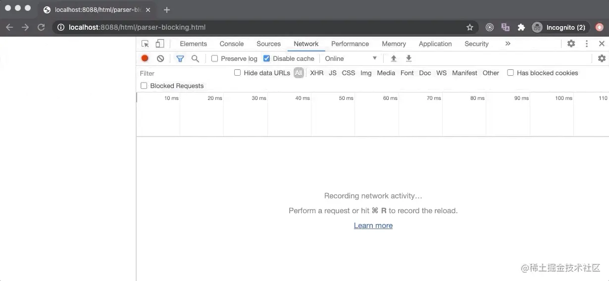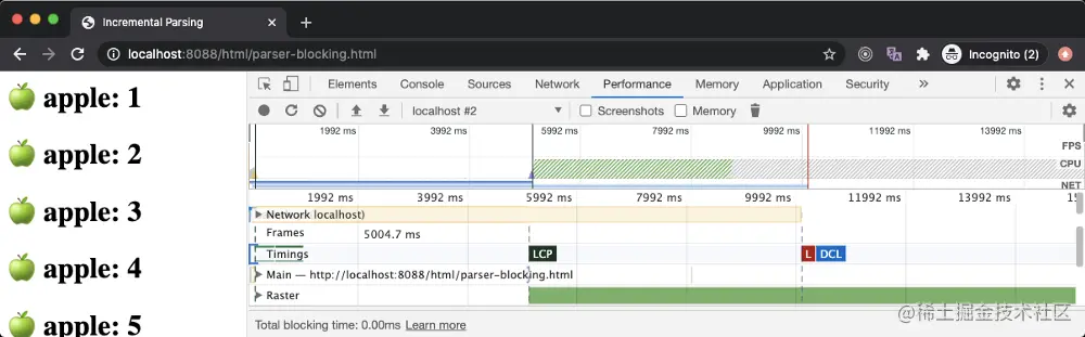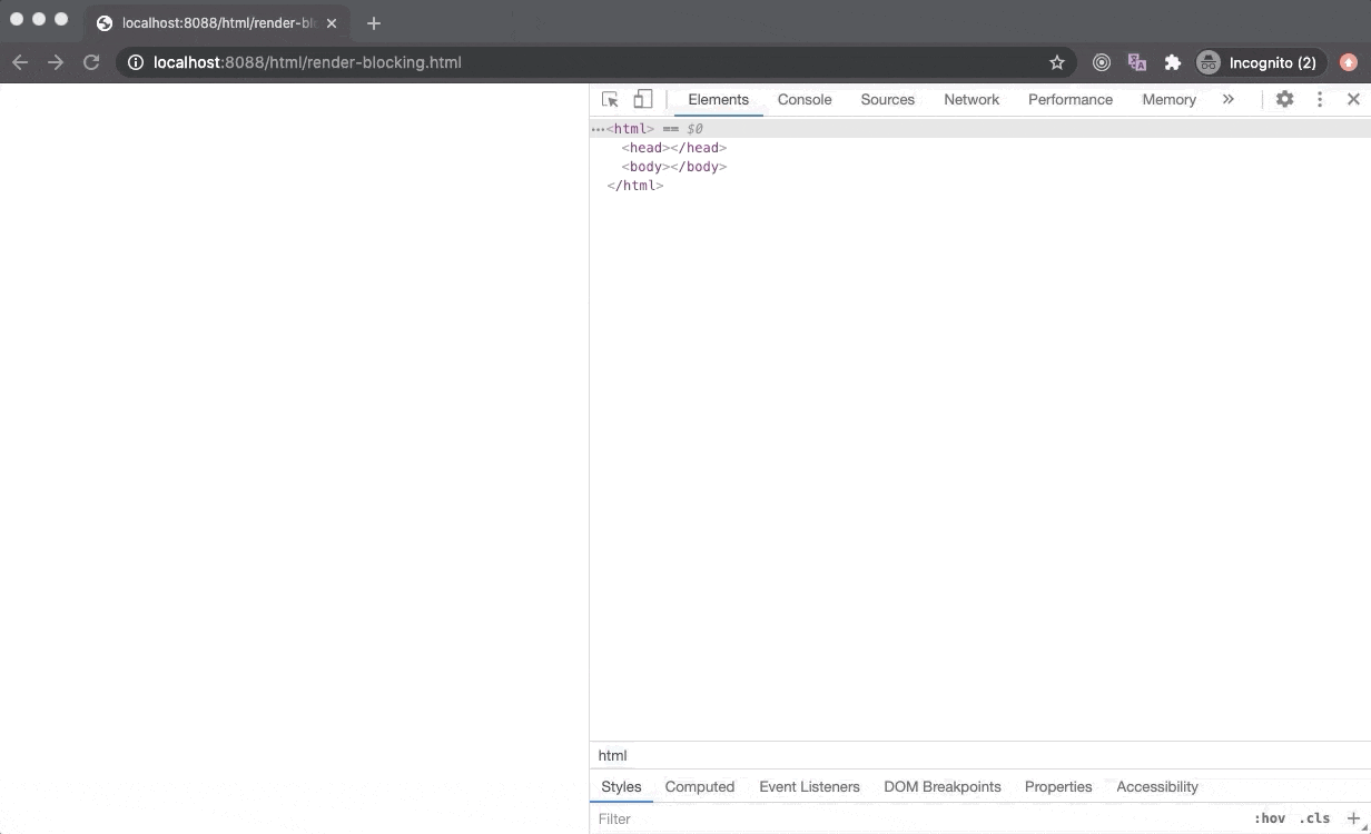 Parser-blocking 也被称为 render-blocking,因为除非 DOM 树被构造出来,否则渲染是不会发生的,但这两者是完全不同的事情,我们稍后会看到