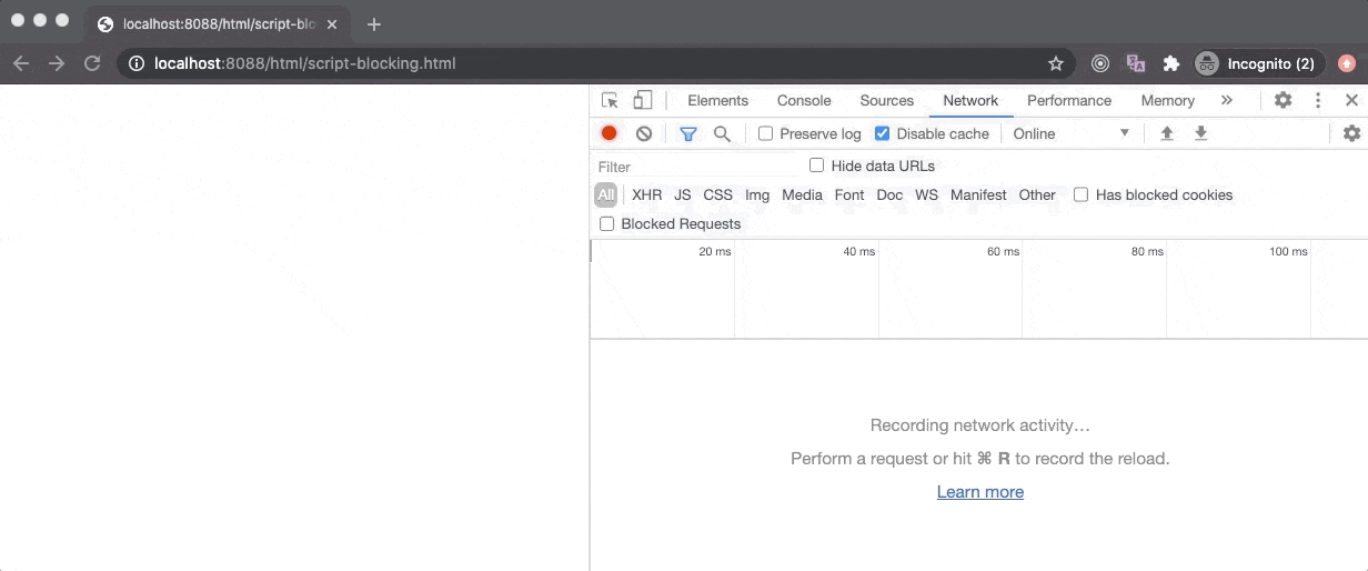 在上面的例子中,parser-blocking.html 文件在 30 个元素后包含了一个阻塞解析的脚本,这就是为什么浏览器一开始显示 30 个元素,停止 DOM 解析,并开始加载脚本文件的原因。第二个脚本文件由于有 defer 属性,所以不会阻止解析,所以一旦 DOM 树完全构建完成,它就会执行。