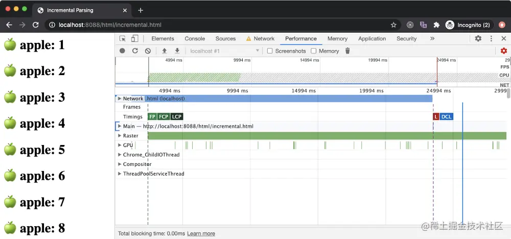 在上面的例子中,我们从 Node 服务器访问了 incremental.html 文件,并将网络速度设置为只有 10kbps(从网络面板)。由于浏览器加载(下载)这个文件需要很长的时间(因为它包含 1000 个 h1 元素),所以浏览器从最初的几个字节构建了一个 DOM 树,并将它们打印在屏幕上(因为它在后台下载 HTML 文件的剩余内容)。