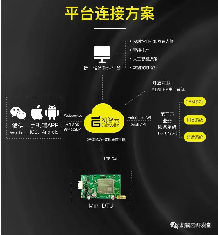 基于机智云平台强大的兼容性及开放性,支持现有主流模组的免开发接入,可提供安全稳定的数据通讯、专业的IoT云服务,包括移动客户端IoT SDK 、丰富的API接口等。