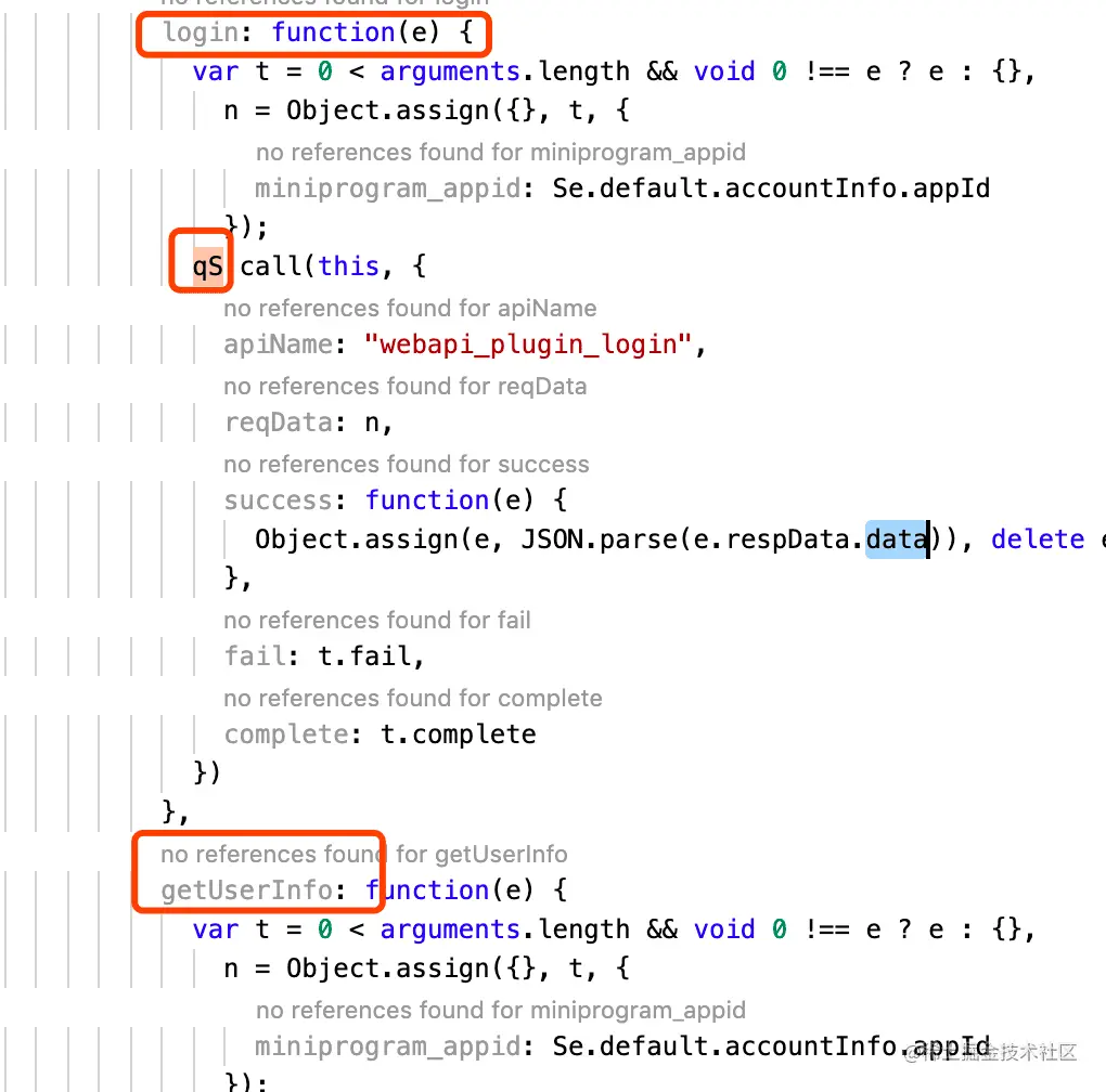 3、我们比较常用的一个 api 通过 wx.login 换取 code 可以看出(标签三)中,是通过逻辑层 service 自发自收的,发起一个请求通过 service 逻辑层处理后在回调回去,通过微信 api 源码可以看到调用的地方