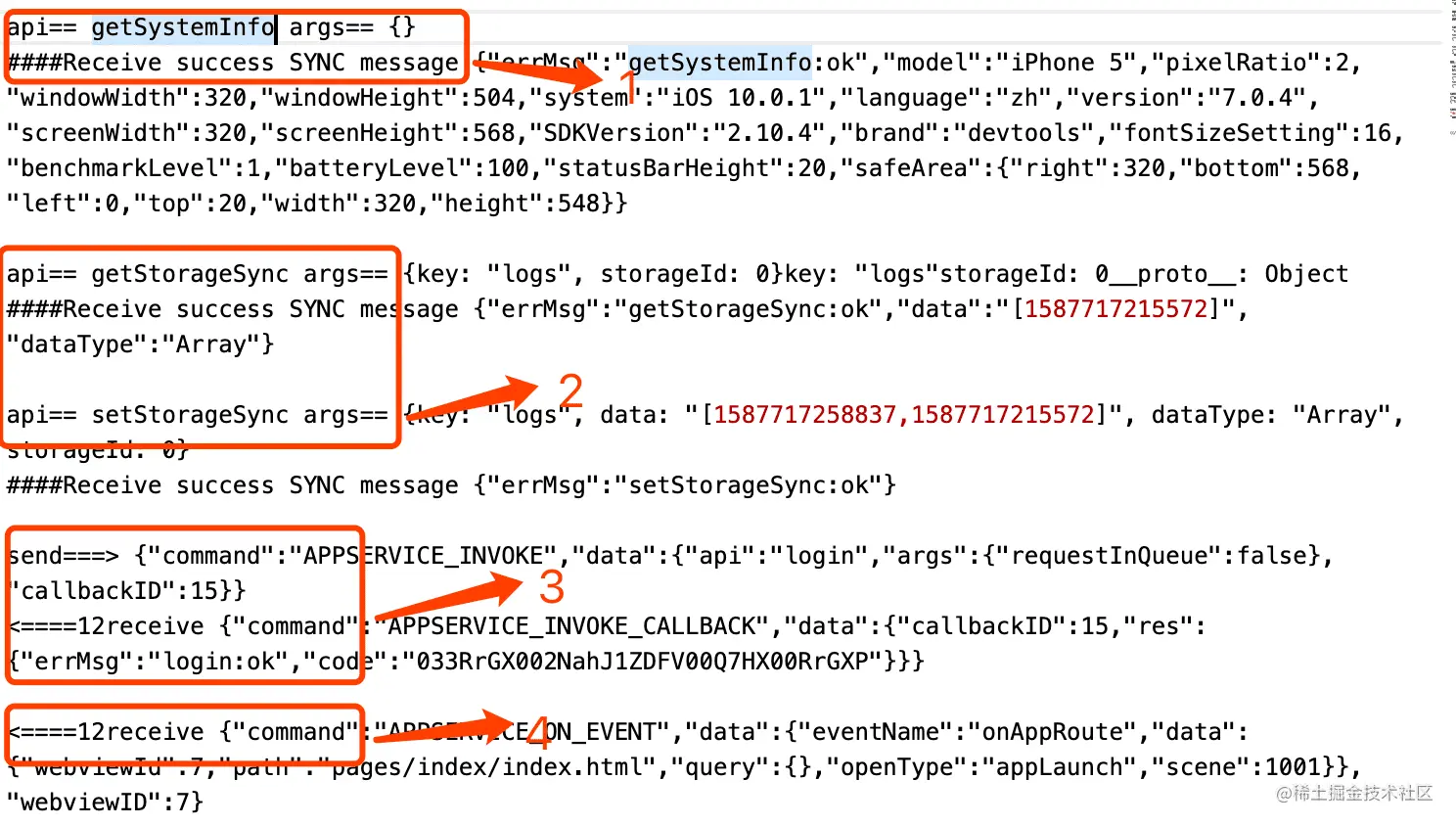 1、首先调用了同步 api getSystemInfo,我们可以看到在我们的项目代码里面没有存在这个 api,但是开发者工具第一步就调用了,所以在项目编译初始化的时候就触发了,至于 Receive 的数据返回的就是工具界面左上角的一些配置数据,大家可以打开自己的开发者工具看看,一些参数是你可以直接从上面观察到的,如手机型号 屏幕占比 网络类型等,这个同步 api 是系统自动调用的不用我们做写什么操作,而且它会比较频繁的调用。(这点我也没理解,当我打开控制台的时候他会调用很多次)