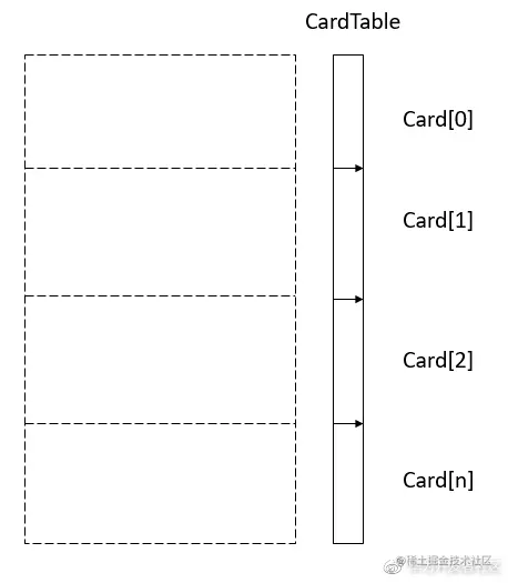 在这里(跨代引用)要引入两个概念,结果集和卡表。卡表可以看作一个老年代分区的集合或者数组,如下图。