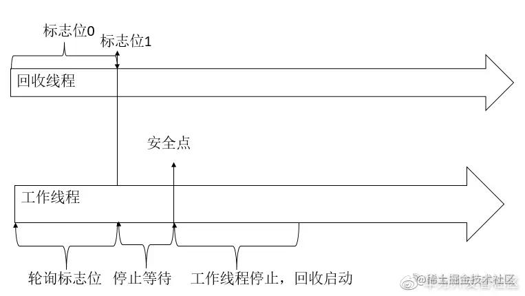 业务线程执行过程中,会不断轮询一个标志位,该标志位处于垃圾回收线程中;