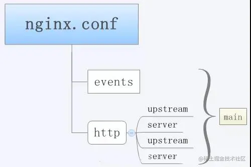 main(全局设置)、server(虚拟主机设置)、upstream(负载均衡服务器设置)和 location(URL匹配特定位置的设置)。