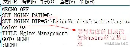 这里我们可以通过命令行start nignx.exe来启动服务器,也可以通过bat批处理文件来启动,打开批处理文件简单处理一下就 可以启动了: