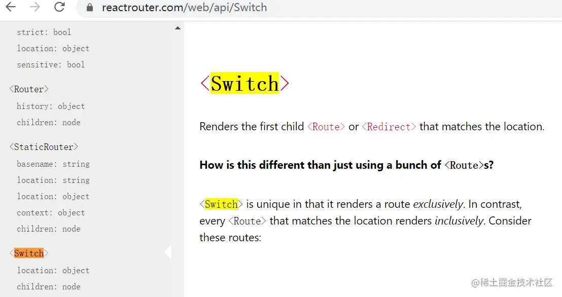<Switch> <Route path='/login' component={Login} exact/> <Route path='/main' component={Main} /> </Switch>Main组件下面如果有子组件的切换,比如菜单栏的切换,则不能加exact, 必须在子路由上去加exact,