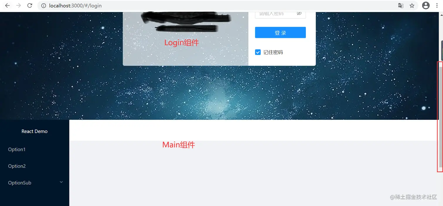 <HashRouter> <Route path='/login' component={Login} /> <Route path='/' component={Main} /> </HashRouter>此时会匹配所有带'/' 的组件,也就是Login和Main 都会被渲染,如下图所示: