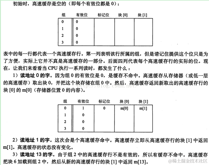 如果CPU请求的字不再组的任何一行中,那么就是缓存不命中,高速缓存必须从存储器中去取包含这个字的块。如下图11