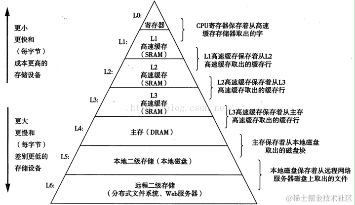 l 硬件:由于不同存储技术的访问时间相差很大。速度较快的技术每个字节的成本要比速度较慢的技术高,而且容量小。CPU和主存之间的速度差距在增大