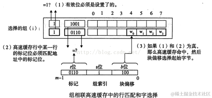 组相联高速缓存中的行匹配比直接映射高速缓存中的更复杂,因为必须检查更多个行的标记位和有效位,以确定所请求的字是是否在集合中。