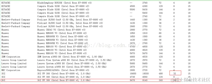 SGI的32路的 32X 8890V2SGI UV 300,SPEC CPU INTRATES的值是18600