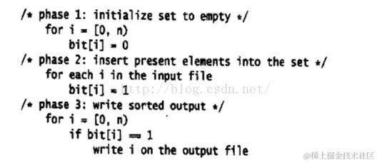 三个阶段就是,1、初始化位数组,2、判断该值是否存在,存在设置为1。3、根据位数组输出排序文件。