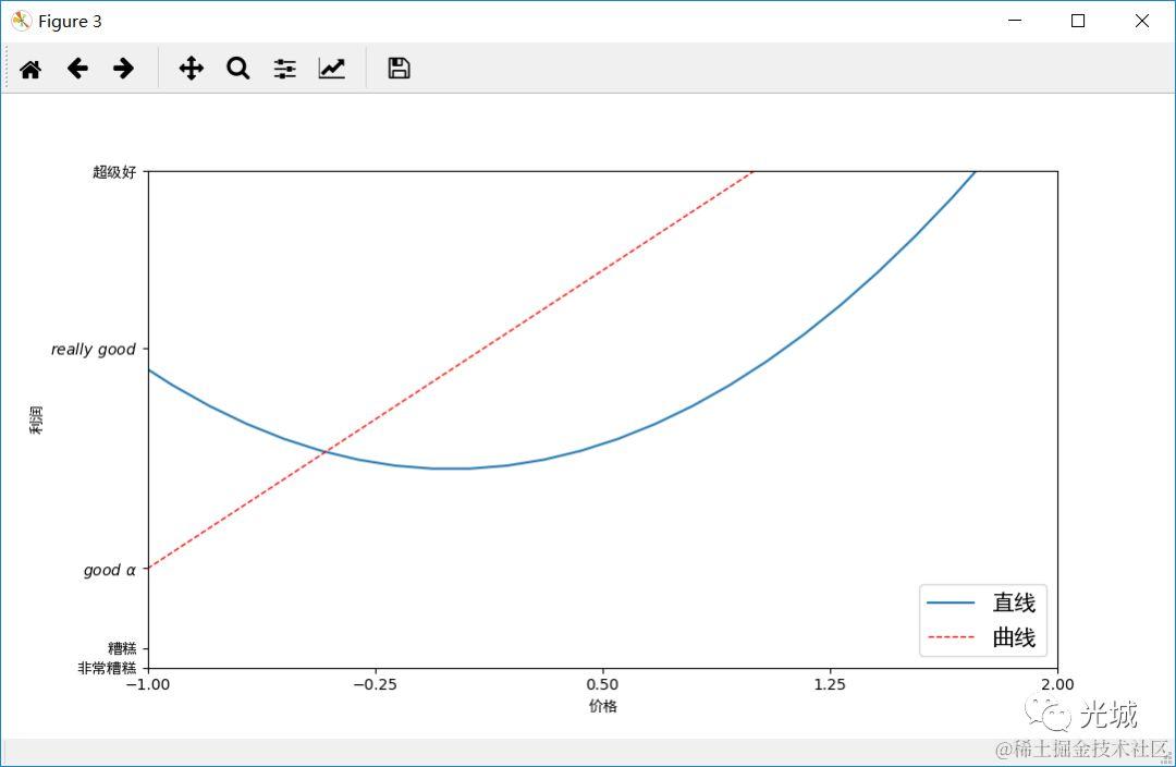 plt.legend(handles=[l1,l2],prop={'family':'SimHei','size':15},loc='lower right',labels=['直线','曲线'])